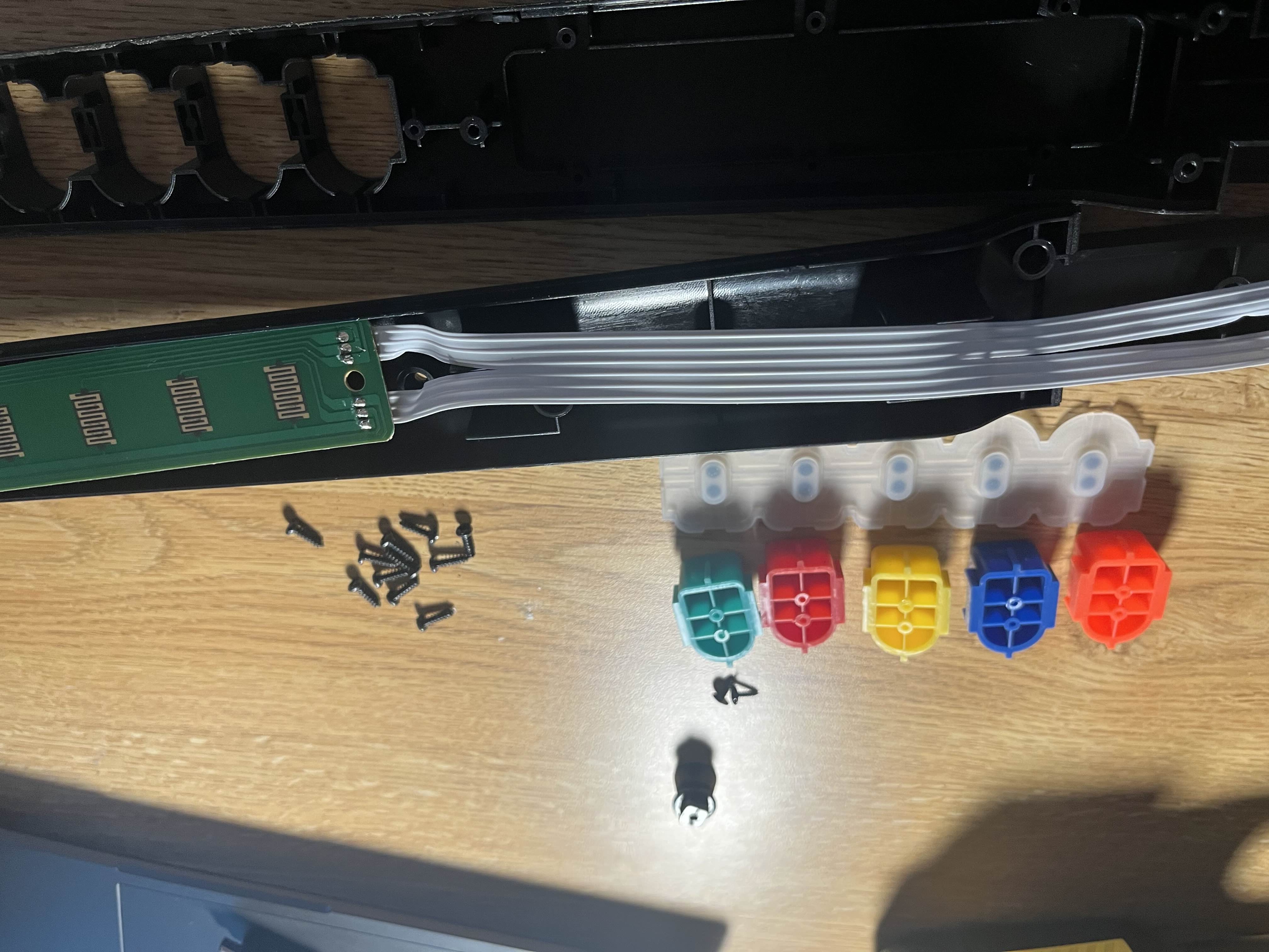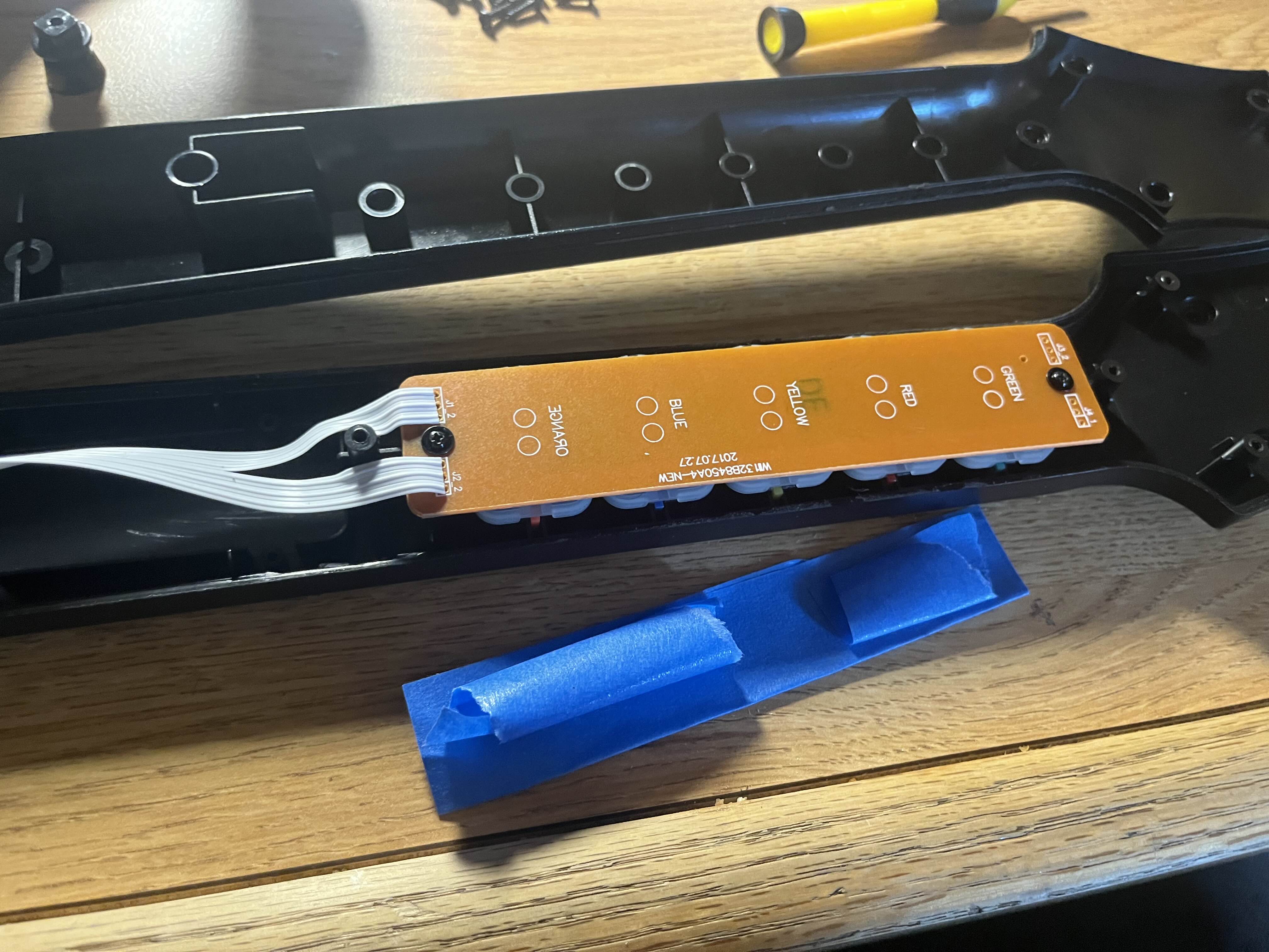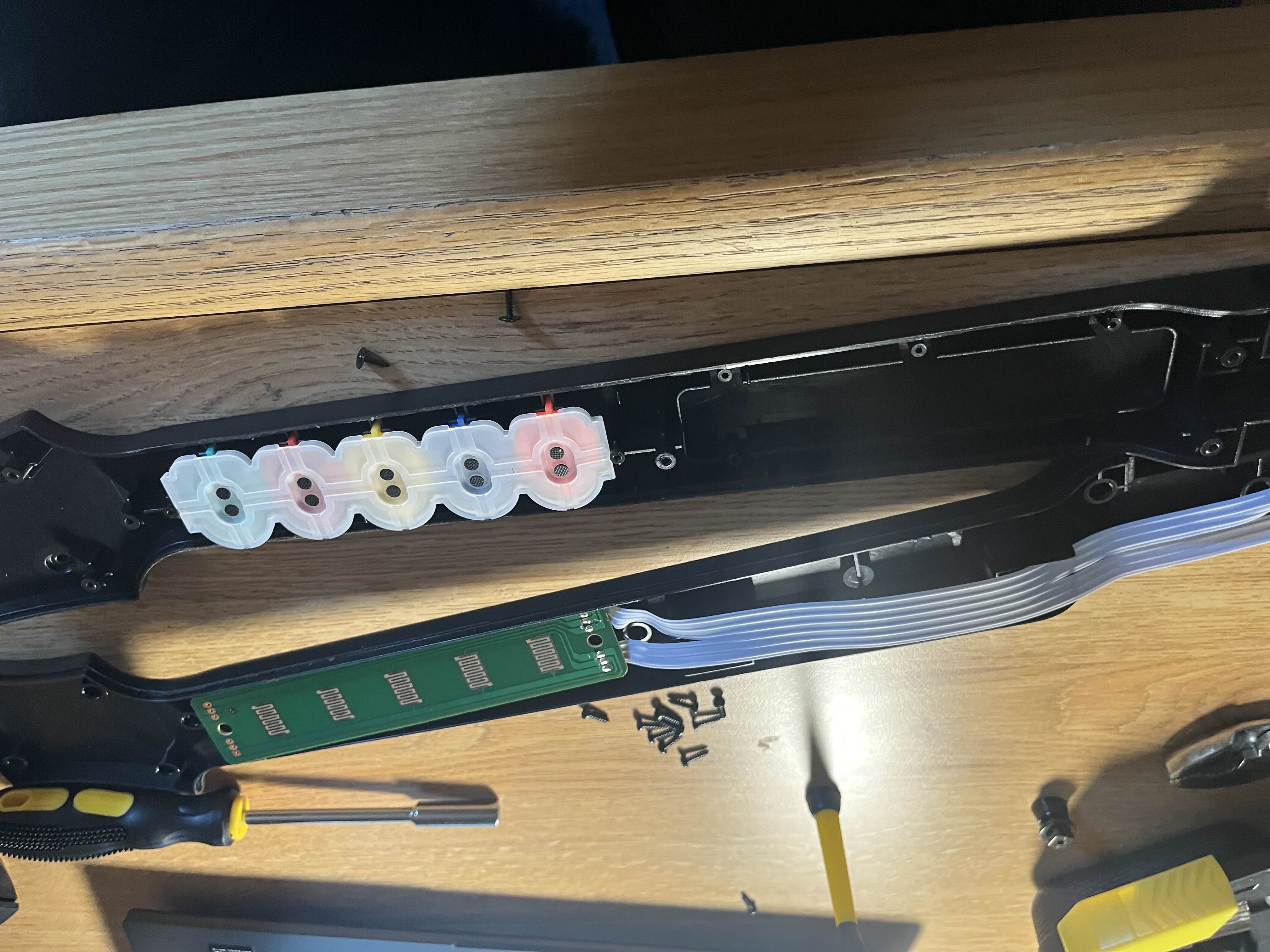 First, remove the two screws holding the brown circuit board down, using a small philips screwdriver. Carefully lift the circuit board and set it aside. Be particularly careful not to trap or fold the ribbon cable at any point as it's quite delicate. Remove the rubber pad from the buttons, and set it aside - this will reveal the fret buttons. You can now remove these too.