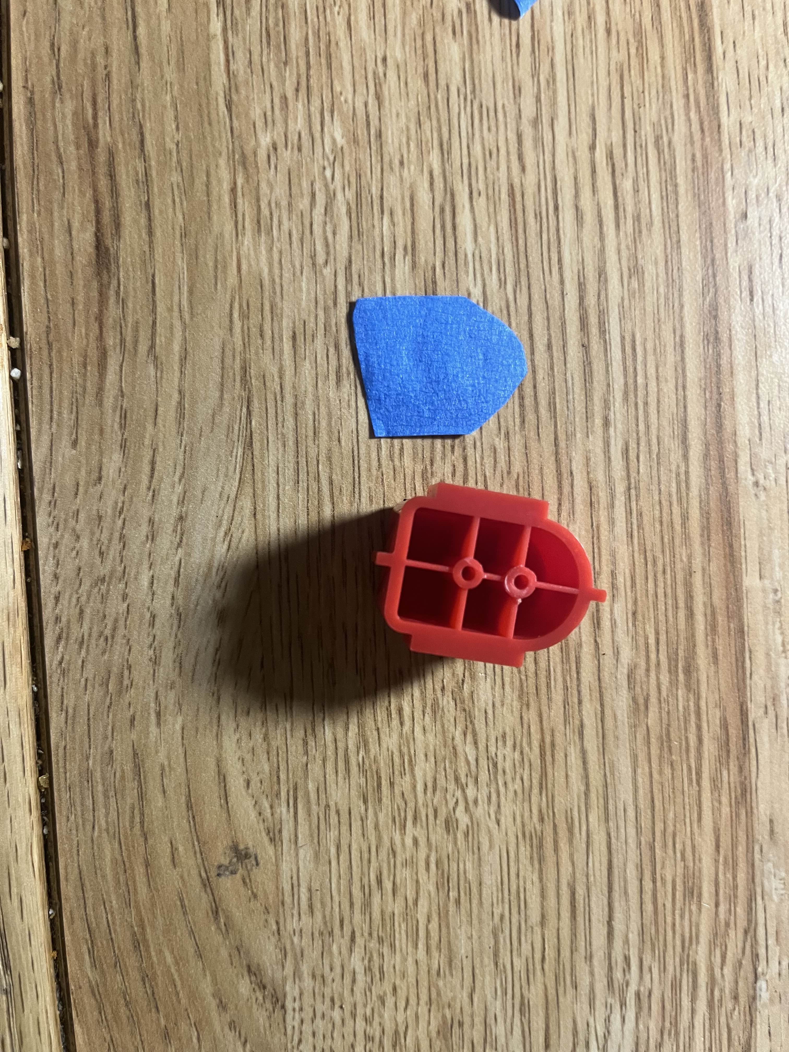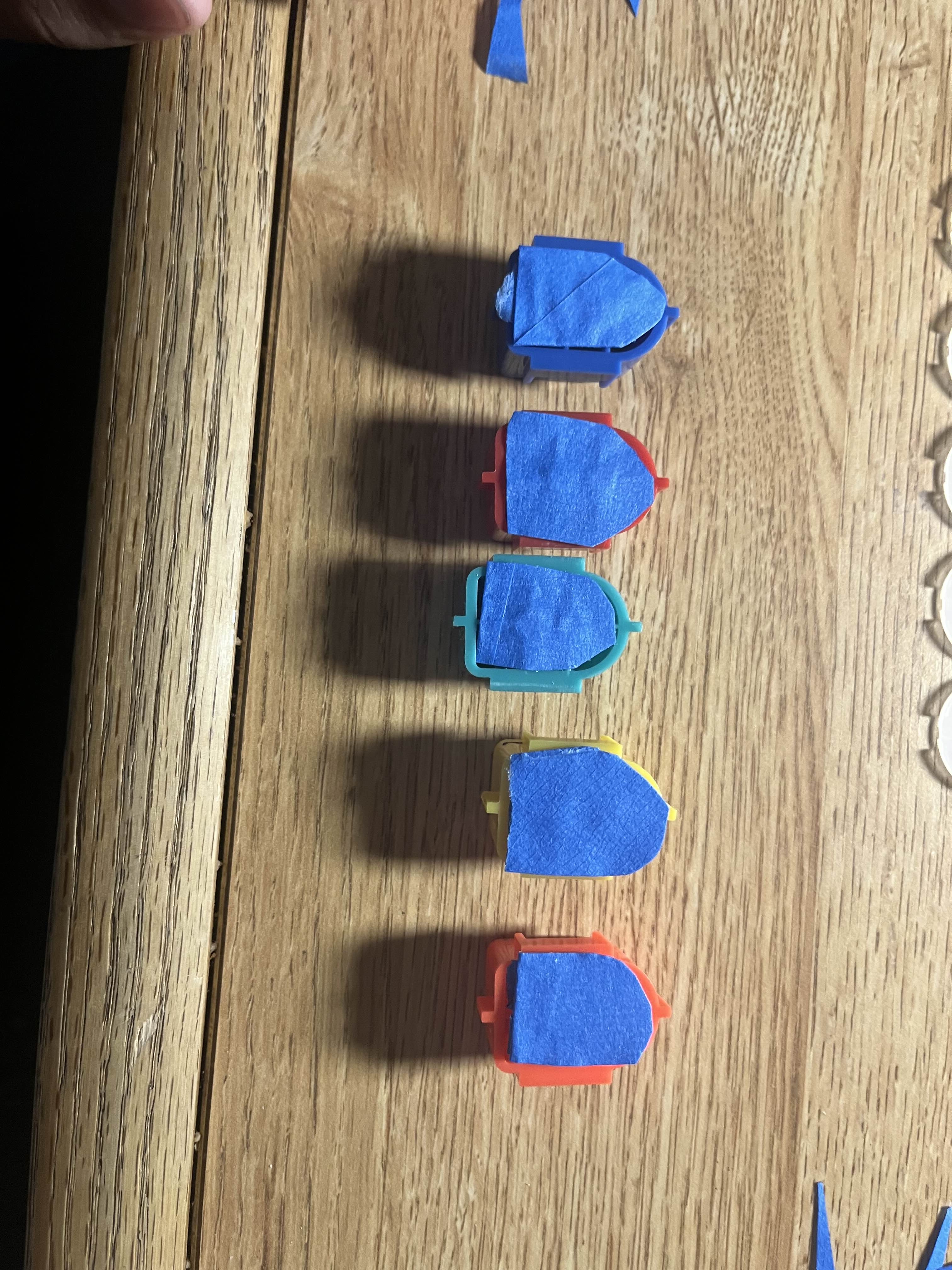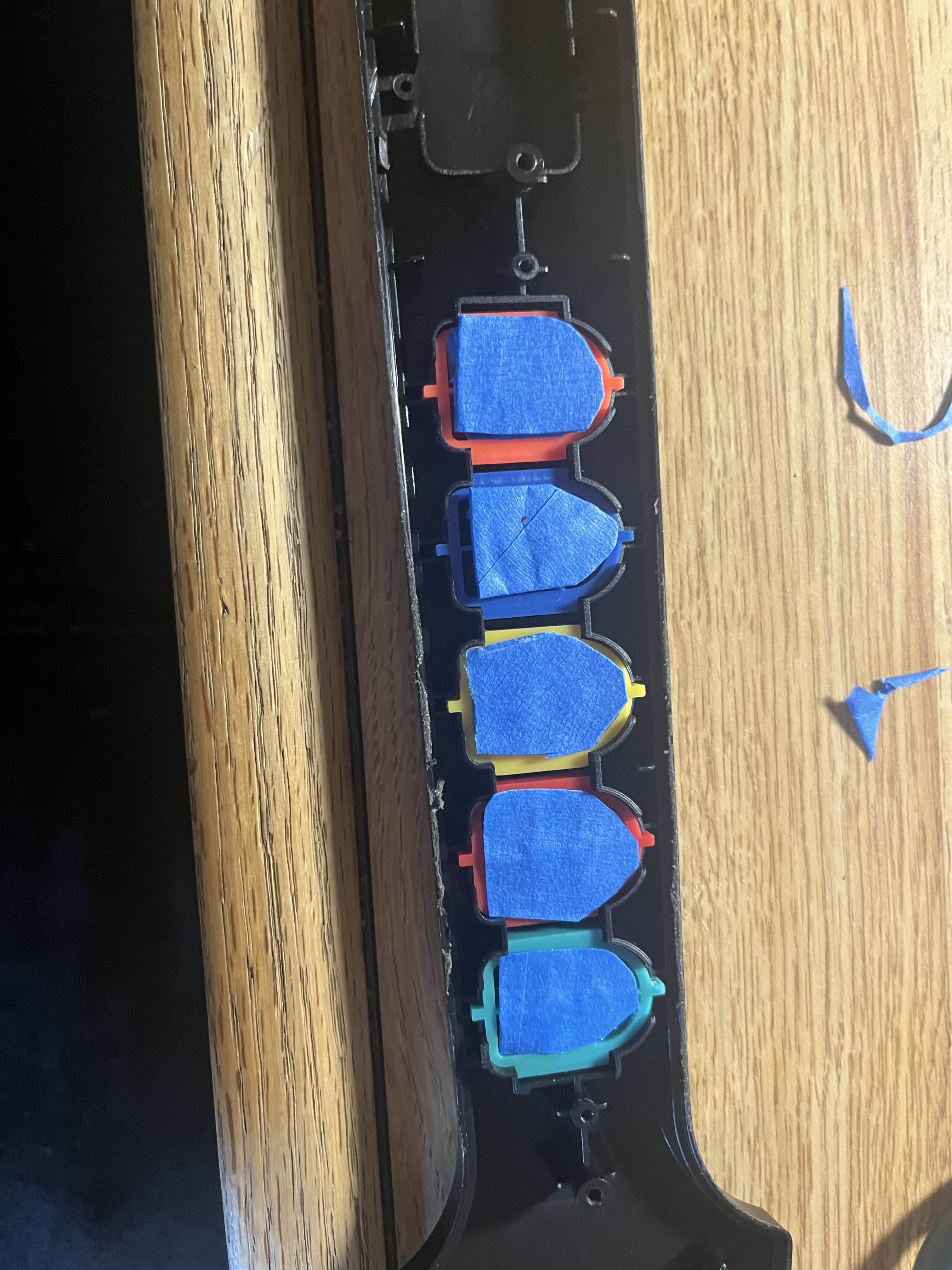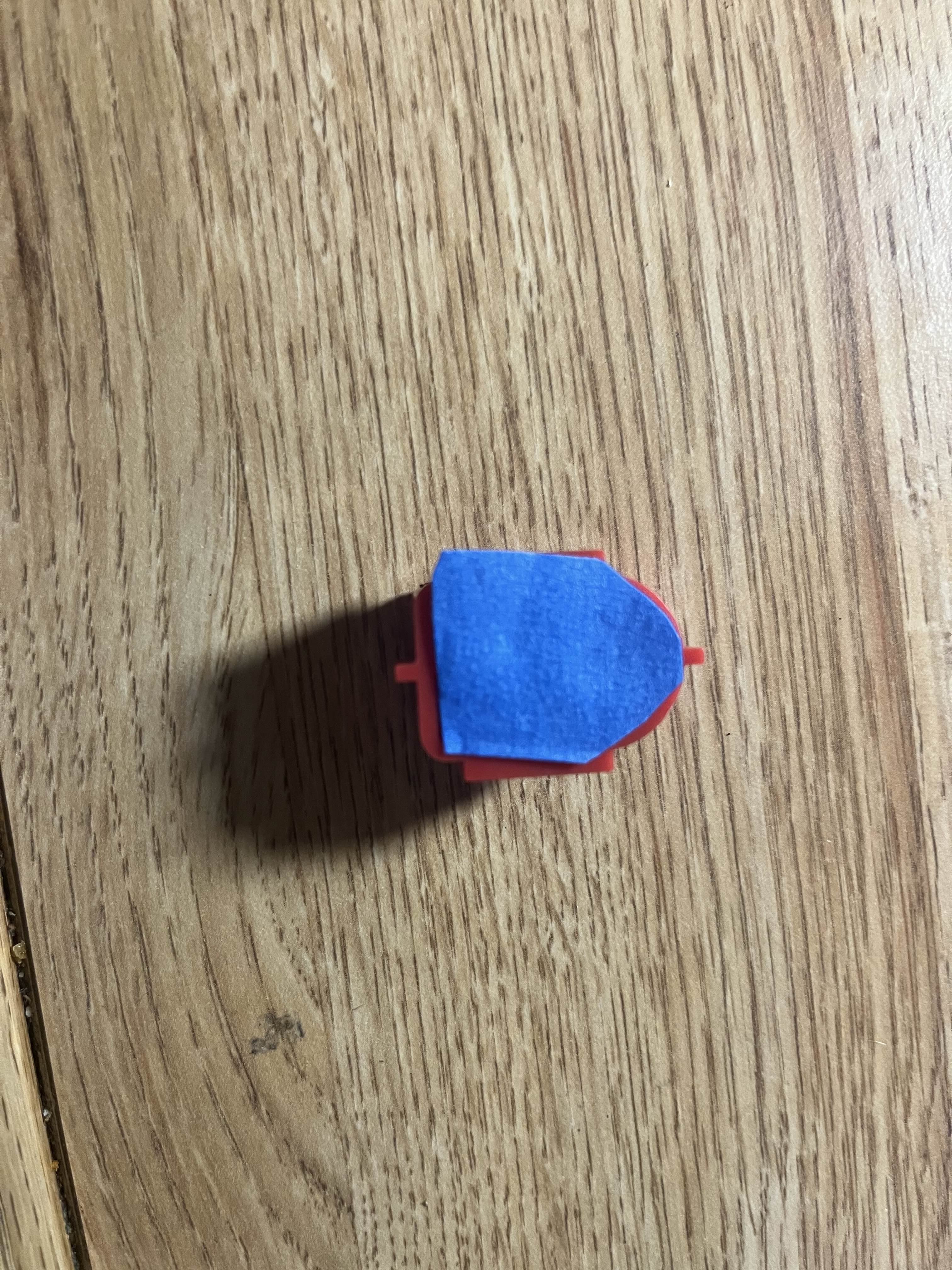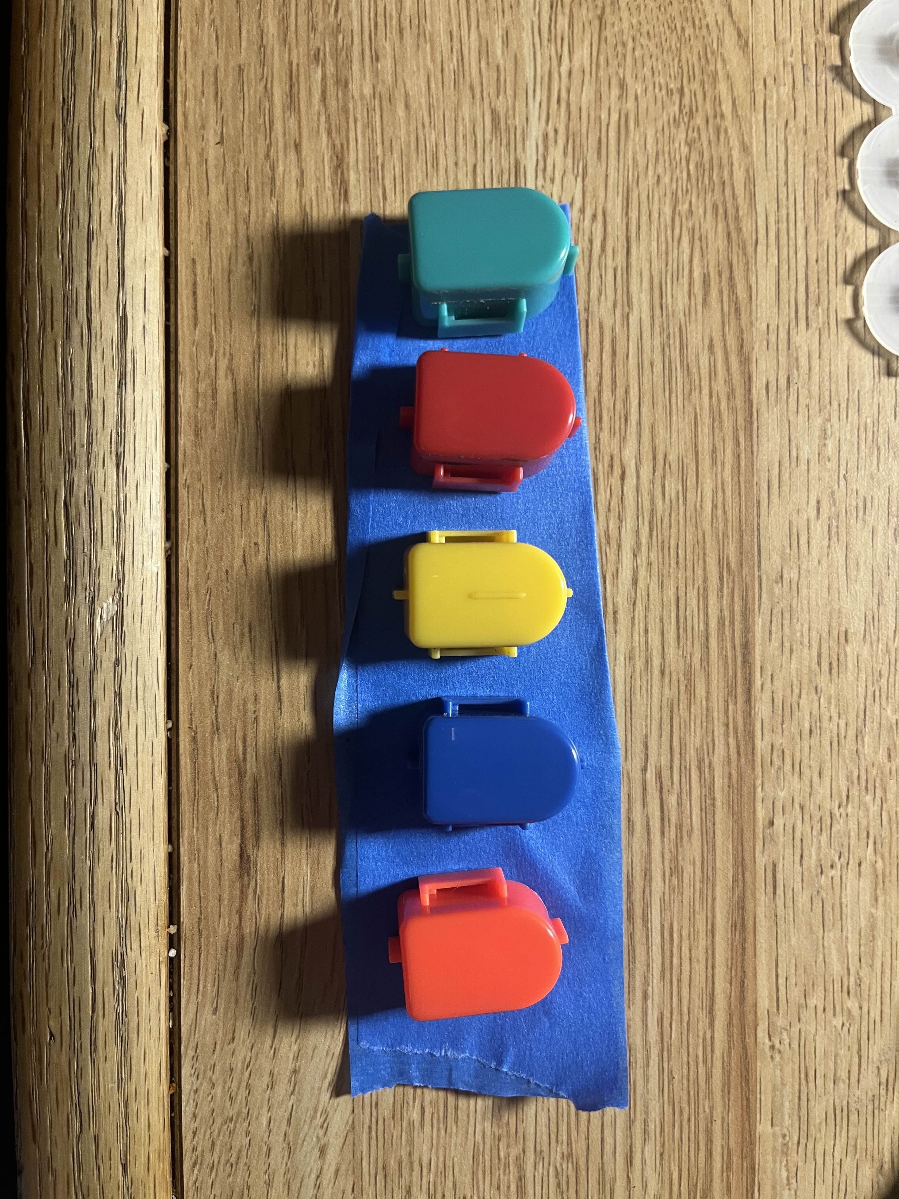 Make 5 small balls of your blu-tack (or equivalent, I used folded tape). Don't make these too big as too much will make the spacer's surface uneven. Roll one small section of tape between your fingers to make a sausage shape, and press it along the center line and 2 holes in the plastic on the back of one of the fret buttons. Then attach a spacer to this, ensuring it is central to the button and not overlapping the sides at all. Do this for all five buttons.